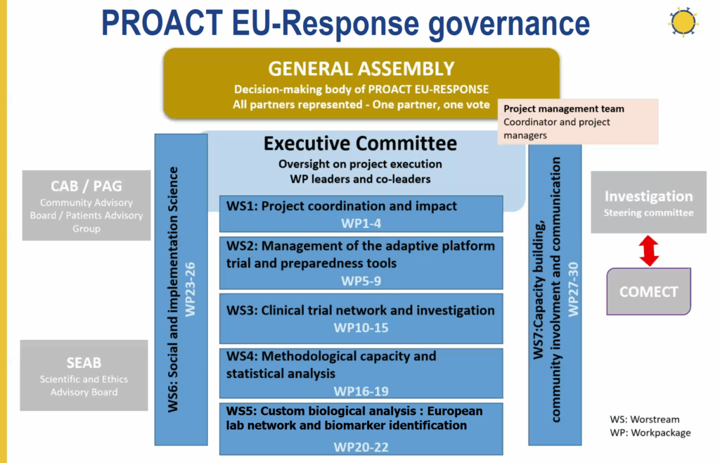 PROACT EU-Response est désormais doté d’une infrastructure vivante qui rassemble monde scientifique et société civile au travers de méthodologies d’essais adaptatifs, de réseaux cliniques et de laboratoires à travers toute l’Europe, des données issues des sciences sociales et l’implication des patients, formant ainsi un ensemble complet et cohérent, dans une volonté de tirer les leçons des crises passées.