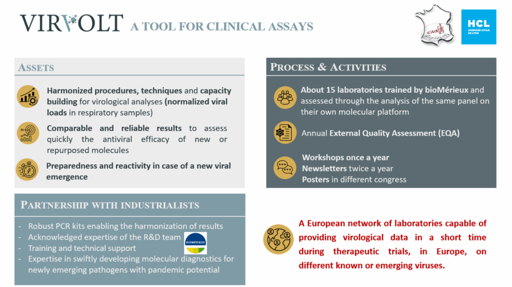 Parallèlement au réseau clinique, VIRvOLT (Virology Operational Laboratories for Drug Testing), un réseau européen de laboratoires de virologie, garantit la fiabilité, la comparabilité et la disponibilité rapide des données virologiques générées lors des essais cliniques. Il fournit une infrastructure robuste pour le suivi de l’efficacité des antiviraux au-delà des frontières.