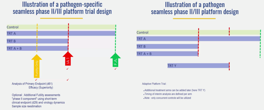 De nouvelles thérapies expérimentales peuvent être introduites à mesure que des données probantes apparaissent, les bras de traitement les moins performants (ndlr : groupes de personnes recevant le même traitement) peuvent être arrêtés et les critères d’éligibilité peuvent être affinés au fil du temps.